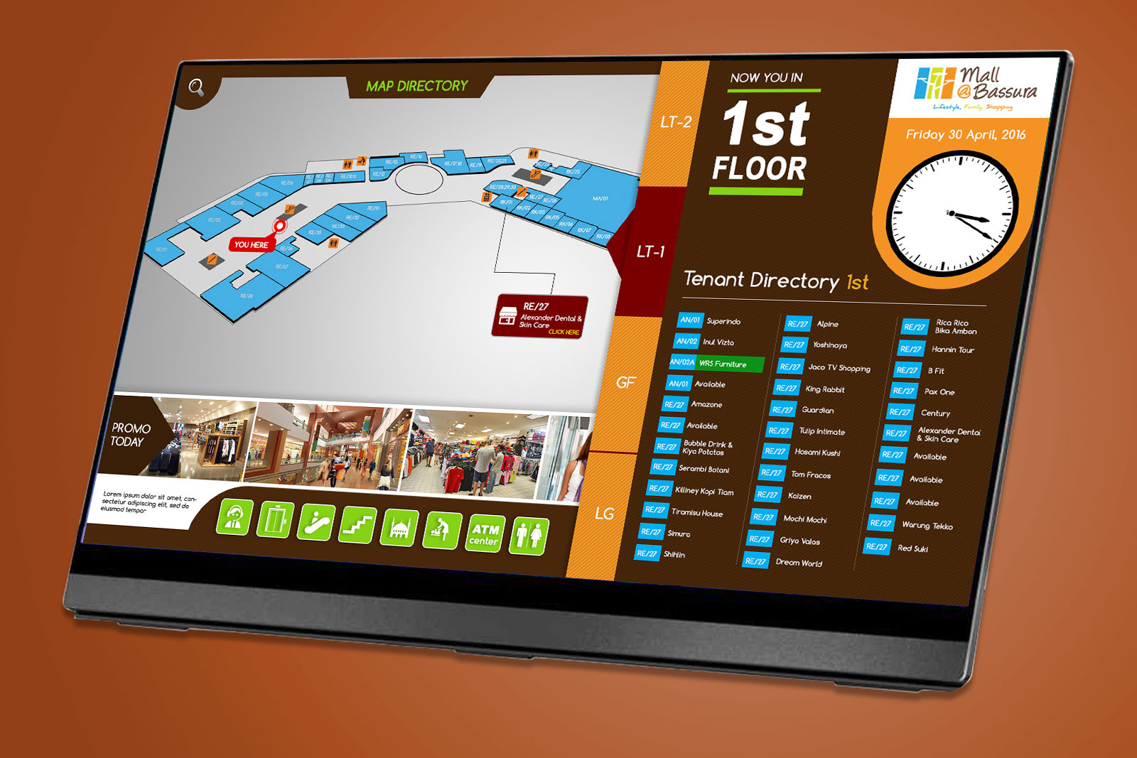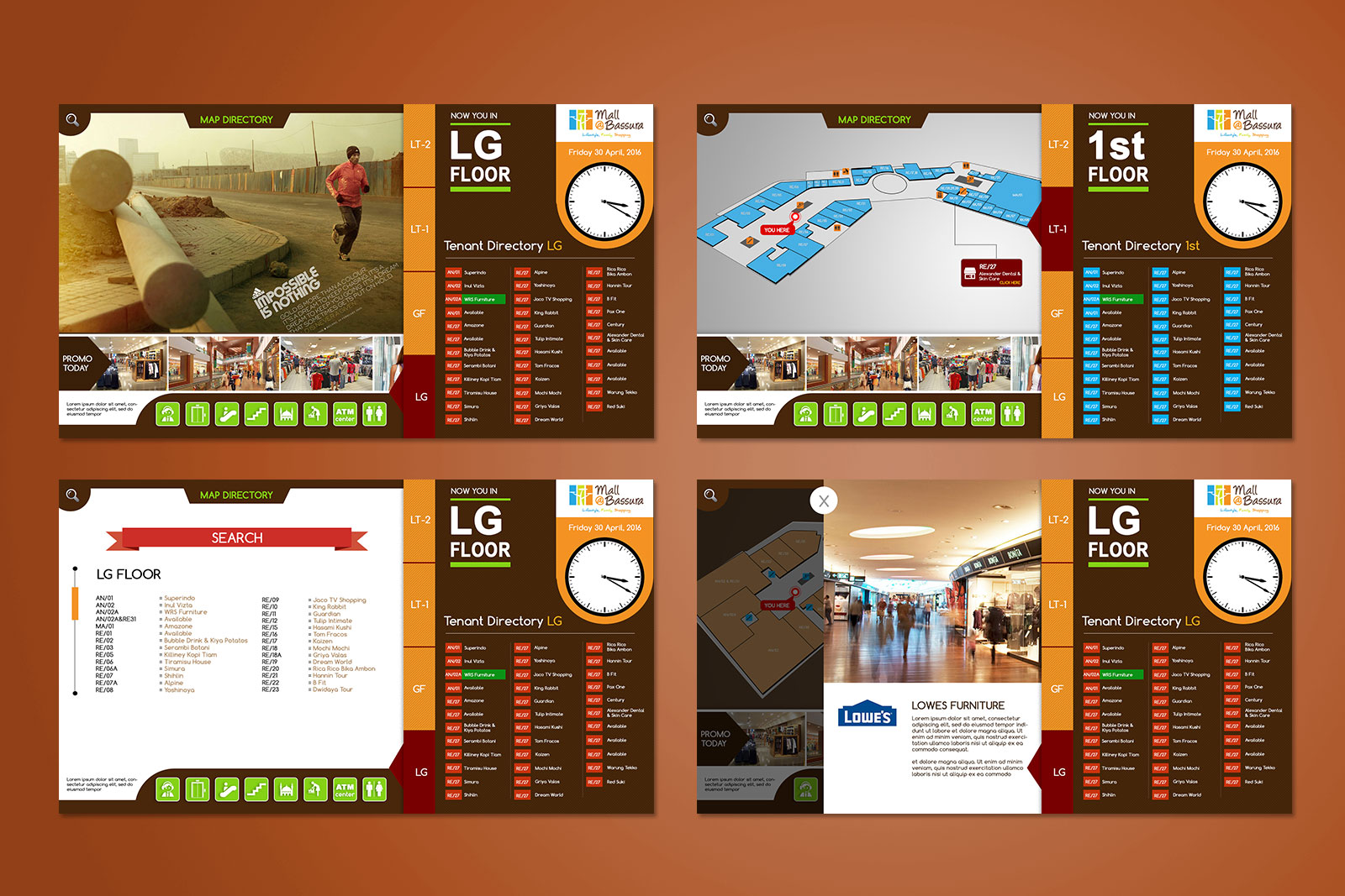 The Touchsceen application used in a Mall as a Tenant Directory as a visitor's guide about locations, information, strategic places needed by visitors. This application is made for a Bassura Mall located in the Jakarta area.